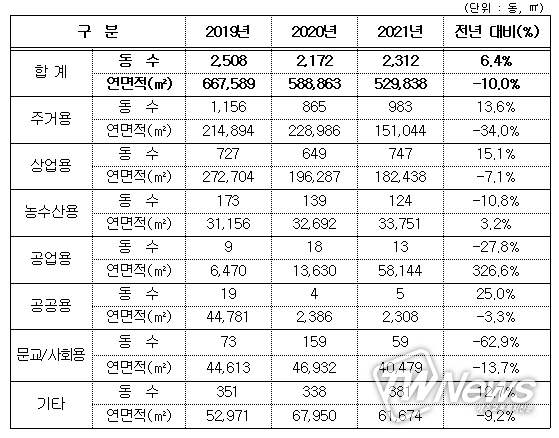 이어 코로나19 영향 및 제주지역 민간 건설경기 침체 장기화에 따라 문교/사회용도 전년 대비 13.7% 줄었으며, 상업용은 7.1% 감소했다.