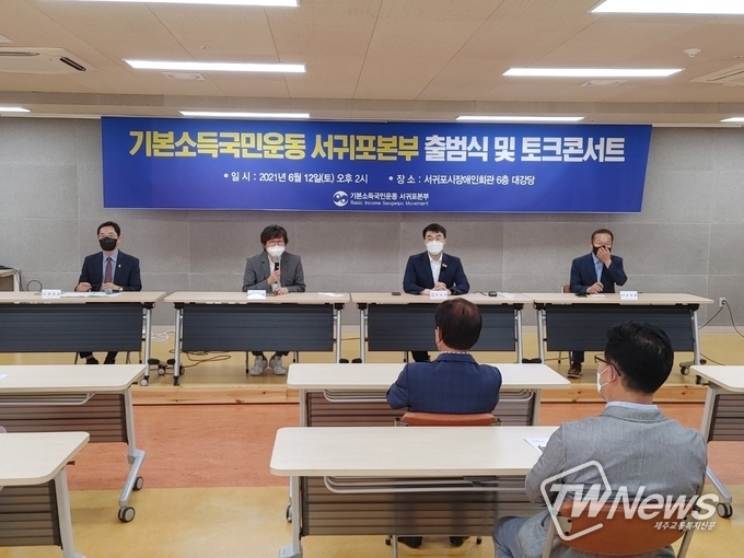 [제주교통복지신문 김현석 기자] 기본소득국민운동 서귀포본부가 지난 12일 오후 2시 서귀포시장애인회관 6층 대강당에서 창립총회 및 출범식·토크콘서트를 개최하고 ‘사람답게 사는 모두의 권리, 기본소득’이라는 기치 아래 ‘불공정’, ‘빈부격차’의 시대적 해결책으로 주목받고 있는 기본소득에 대한 서귀포 시민의 인식 제고와 국민운동 확산의 시작을 알렸다.