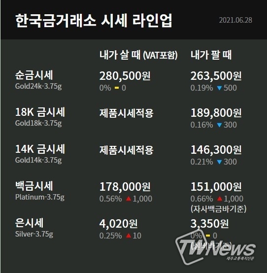 [제주교통복지신문 김도형 기자] 지난 28일 한국금거래소에 따르면 순금 1돈(Gold24k-3.75)은 28만 500원(살때)에 거래할 수 있다. 팔때는 26만 3,500원에 거래할 수 있다.