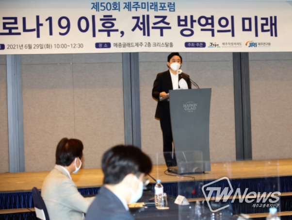 원희룡 지사는 29일 메종글래드 2층 크리스탈홀에서 열린 ‘제50회 제주미래포럼’에서 기조사를 통해 코로나19 방역 최전선에서 느낀 방역 교훈을 공유하는 한편, 미래 방역의 발전 방향에 대한 의견을 제시했다.