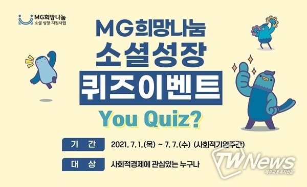 사회적기업 주간을 맞아 진행하는 이번 퀴즈 이벤트는 사회적경제에 관심 있는 누구나 참여 가능하다. 퀴즈는 총 3개 문항으로 사회적경제조직의 성장을 지원해 사회적경제 활성화에 기여하는 ‘MG희망나눔 소셜 성장 지원사업’ 관련 내용으로 구성됐다.