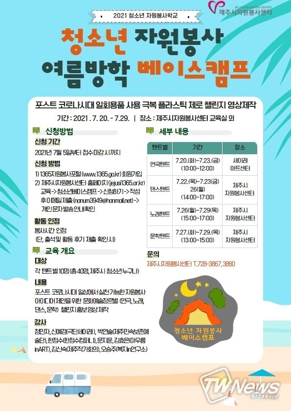 제주시에 거주하는 청소년이면 누구나 참여할 수 있으며, 접수는 1365 자원봉사 포털에 회원가입 후 제주시자원봉사센터 홈페이지에서 사전 참가 신청서를 다운받아 센터 이메일로 제출하면 된다.