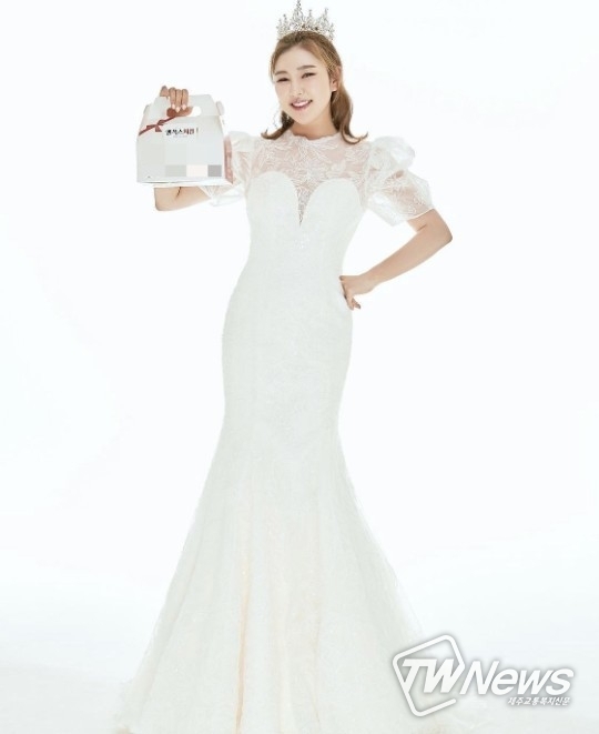 사진 속에서 한가인은 웨딩드레스를 입고 한손에 치킨박스를 들고 있다. 특히 다이어트 성공 후 날씬한 자태가 시선을 끈다.