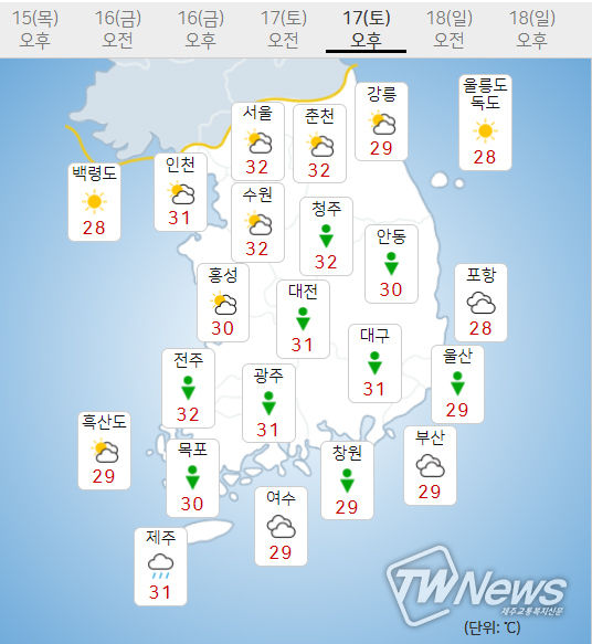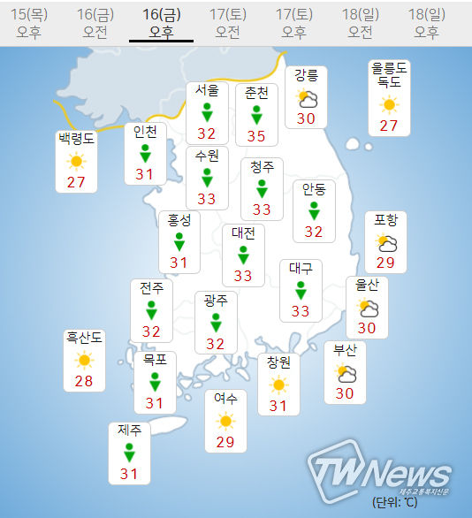 16일 낮최고기온은 서울32도, 인천31도, 대전33도, 청주33도, 광주32도, 강릉30도, 대구33도, 부산30도, 여수29도, 제주도31도이다.