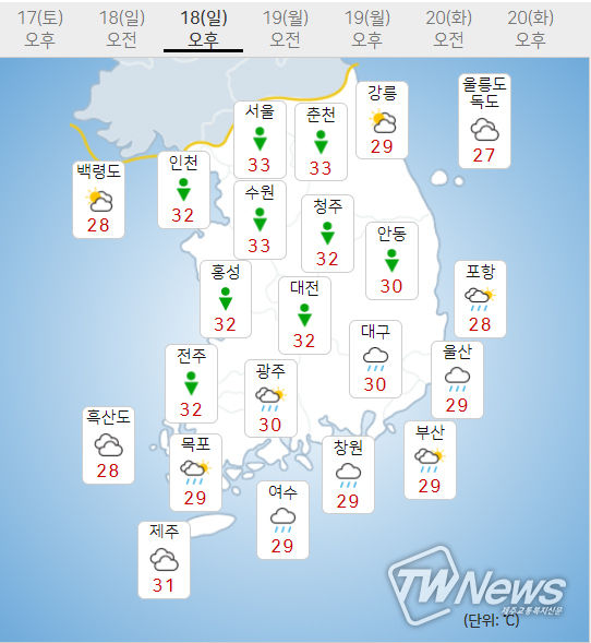아침 기온은 18~25도, 낮 기온은 26~32도가 되겠다