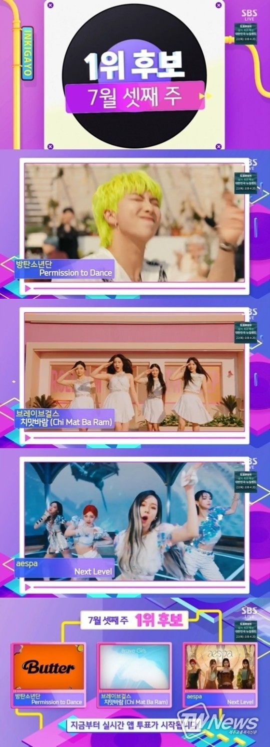 이날 방송에서 1위 후보에 오른 세 팀은 방탄소년단의 'Permission to Dance', 브레이브걸스의 '치맛바람', aespa의 'Next Level'이었다.