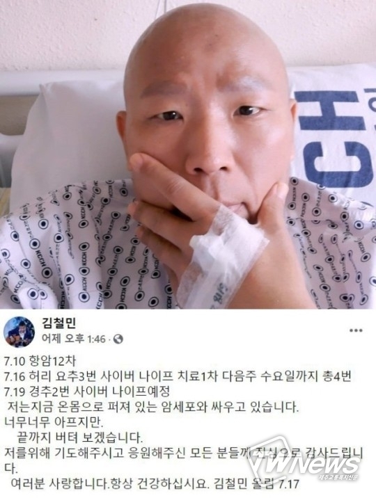 김철민은 자신의 SNS에 치료 일정을 공개한 뒤 "지금 온몸으로 퍼져있는 암세포와 싸우고 있다. 너무너무 아프지만 끝까지 버텨 보겠다"고 말했다.