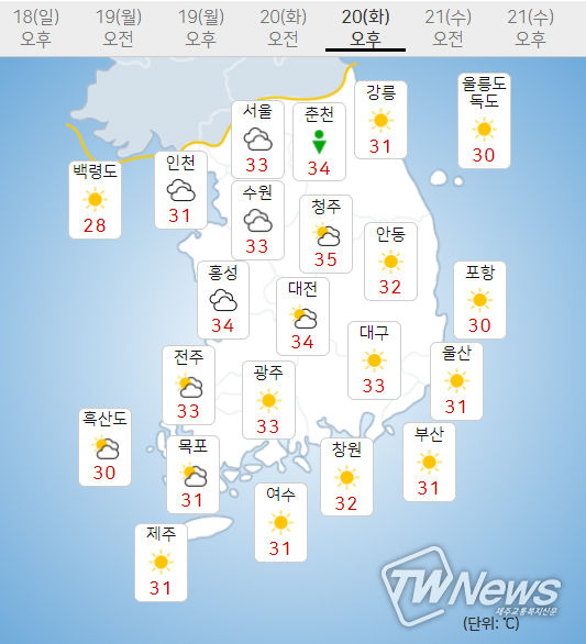 서울33도,수원33도,대전33도, 여수30도,강릉30도,대구31도,부산31도, 제주도31도이다.