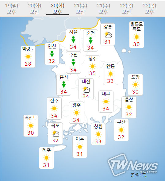 (20일) 아침최저기온은 22~25도, 낮최고기온은 33~34도가 되겠다.