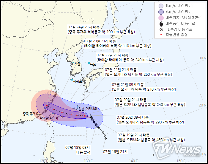 23일 21시 타이완 타이베이 북쪽 약 110km부근 해상