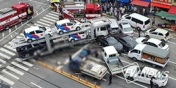 승용차 6대를 실은 탁송차량은 내리막길에서 우회전하던 중 횡단보도를 넘어 건너편에 있던 차량 10대를 잇달아 들이받았다.