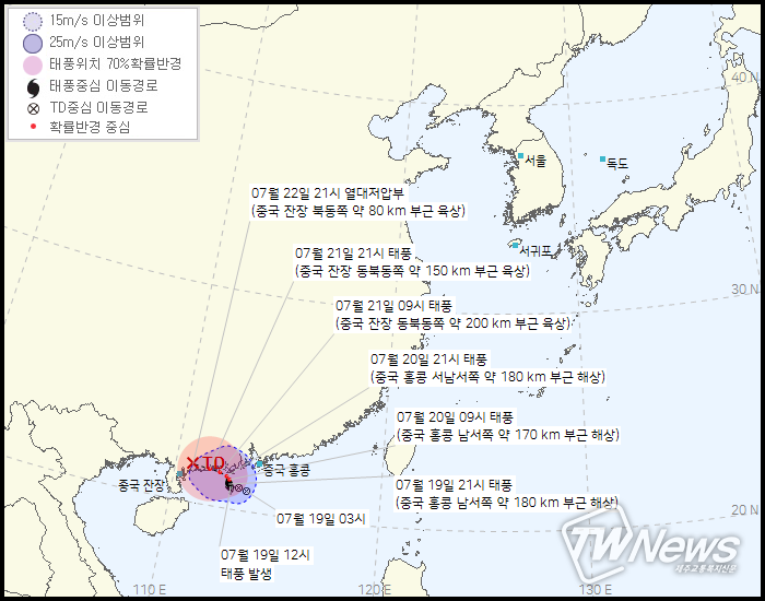 제7호 태풍 '츰파카'의 20일 15시 현재 4km/h 이동속도로 북쪽으로 이동하고 있다
