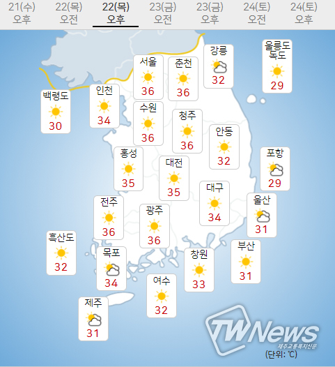 (22일) 아침최저기온은 서울 26도, 인천 26도, 수원 25도 등 21~26도, 낮최고기온은 서울 36도, 인천 34도, 수원 36도 등 34~37도가 되겠다.
