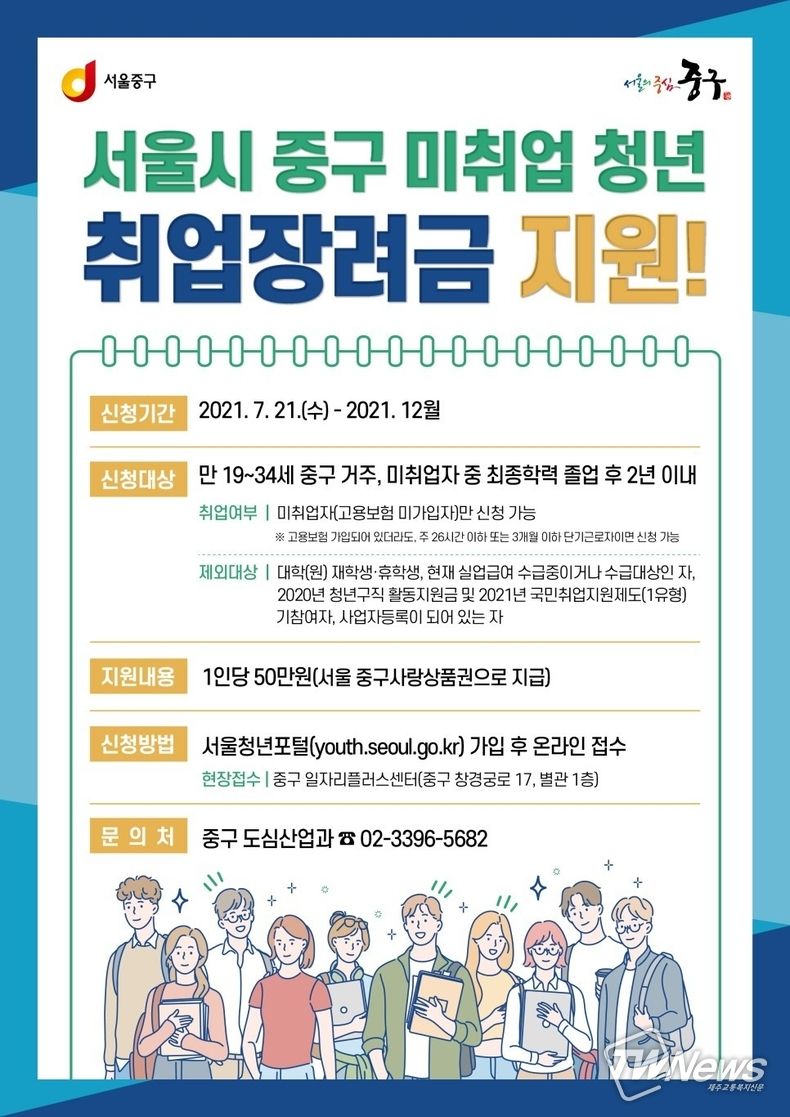 [제주교통복지신문 최효열 기자] 코로나19가 장기화되며 어려움을 겪고 있는 미취업 청년층에게 서울시 중구가 '취업장려금' 50만 원을 지원한다. 서울시 중구는 위축된 고용 시장에서 힘든 시간을 보내고 있을 청년들의 생활에 조금이나마 보탬이 되었으면 좋겠다고 전했다.