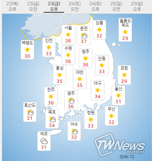 [제주교통복지신문 최효열 기자] 기상청은 금요일인 23일 서울36도, 춘천37도, 강릉32도, 대전35도, 여수32도, 대구34도 부산32도, 제주도31도를 예상하며 폭염경보가 이어질 것으로 날씨예보했다.