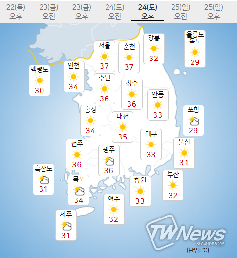 (24일) 아침최저기온은 서울 26도, 인천 26도, 수원 26도 등 22~27도, 낮최고기온은 서울 37도, 인천 34도, 수원 36도 등 34~38도가 되겠다.