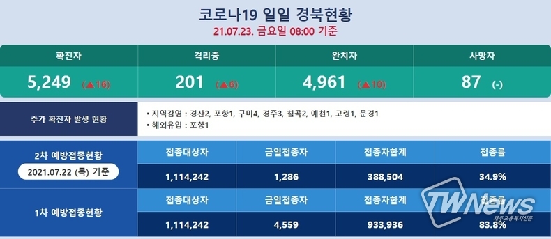 [제주교통복지신문 최효열 기자] 경상북도에서 코로나 확진자 21명이 발생했다.