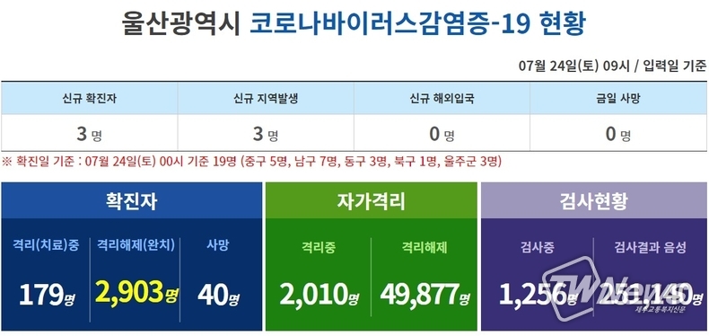 24일 울산광역시에 따르면 이날 중구 5명, 남구 7명, 동구 3명, 북구 1명, 울주군 3명 등 19명이 코로나 확진 판정을 받았다.