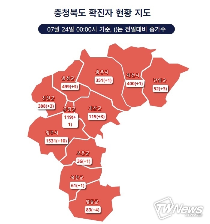충청북도에 따르면 24일 0시 기준 청주 10명, 영동 4명, 단양 3명, 음성 3명, 진천 3명, 괴산 3명, 제천 1명, 충주 1명, 증평 1명, 보은 1명, 옥천 1명 등 31명이 코로나 확진 판정을 받았다.
