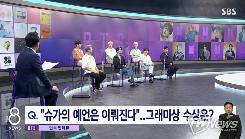 방탄소년단은 24일 서울 목동 SBS 본사 뉴스 스튜디오를 방문해 김용태 앵커와 대담을 진행했다.