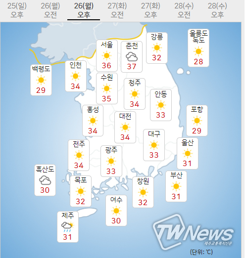 * 주요지점 낮최고기온(최고체감온도) 현황(25일 17시 현재, 단위: ℃)