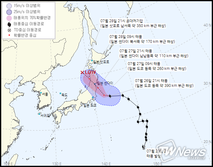 28일09시 일본 센다이 북서쪽 약 170km부근 해상으로 이동하며 28일 21시 일본 삿포로 남서쪽 약 350km부근 해상에서 온대저기압으로 약화될 전망이다.