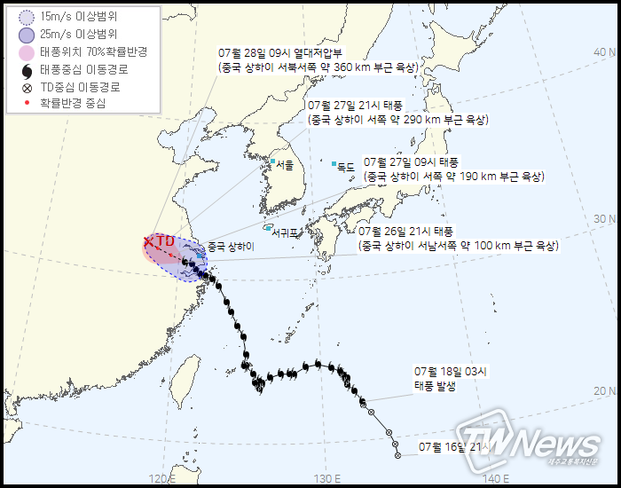 이 태풍으로 우리나라에 영향을 준다. 제주도해상과 남해서부서쪽먼바다, 서해남부먼바다는 내일까지 바람이 시속 35~70km로 매우 강하게 불고 물결이 최대 5m 까지 매우 높게 일겠다.