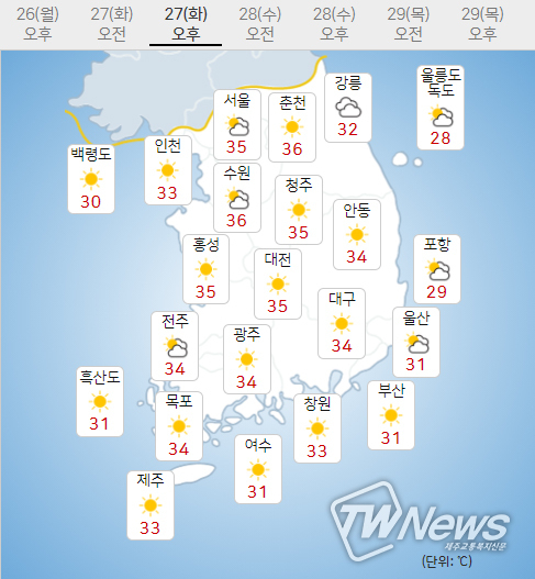 (27일) 아침최저기온은 강원내륙 21~25도, 강원산지(대관령, 태백) 18~19도, 강원동해안 23~25도, 낮최고기온은 강원내륙 35~37도, 강원산지(대관령, 태백) 27~28도, 강원동해안 29~31도가 되겠다.