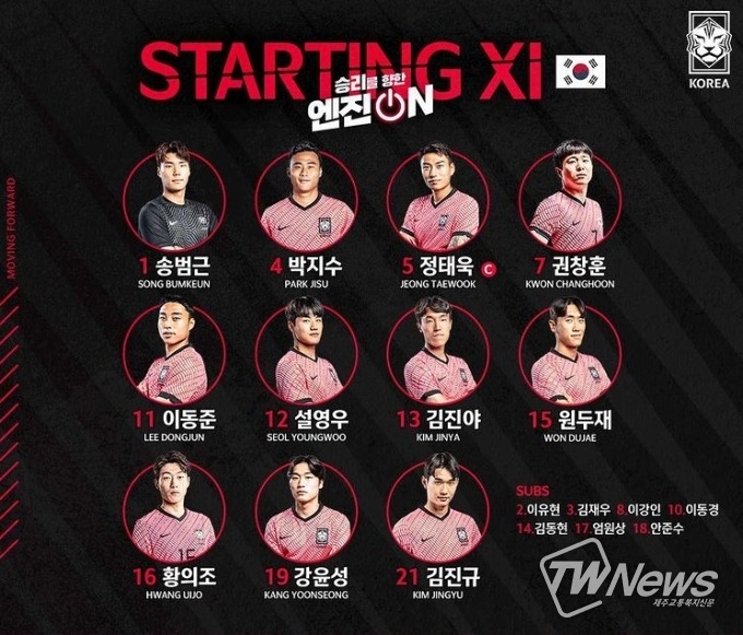 포백은 설영우(울산), 정태욱(대구), 박지수(김천), 강윤성(제주)이 늘어섰다. 골키퍼는 송범근(전북)이 맡았다.
