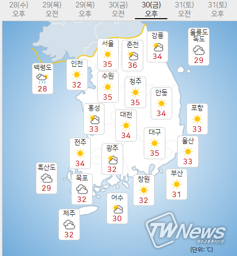 [제주교통복지신문 최효열 기자] 기상청은 목요일인 29일 낮최고기온이 서울34도, 수원34도, 대전34도, 청주35도, 춘천36도, 강릉33도, 광주33도, 여수30도, 대구34도, 부산31도, 제주도33도이다.