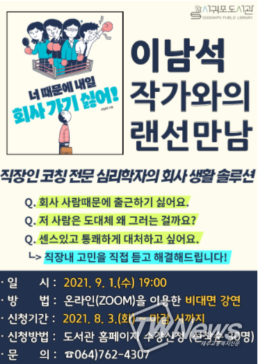 [제주교통복지신문=박희찬 기자] 제주도교육청 서귀포도서관은 독자와 작가가 직접 소통하는 기회를 통해 이용자들의 독서에 대한 흥미를 고취시키고자‘이남석 작가와의 만남’을 2021년 9월 1일 19시에 비대면 강연으로 운영한다.