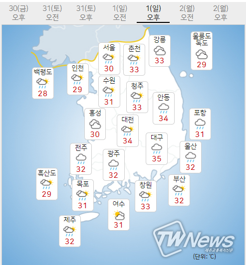 [제주교통복지신문 최효열 기자] 기상청은 토요일인 31일 전국에 비소식이 있으며 서울33도, 수원33도, 대전34도, 청주34도, 여수31도, 강릉34도, 대구35도, 부산31도, 제주도31도를 기록하겠다고 날씨예보했다.