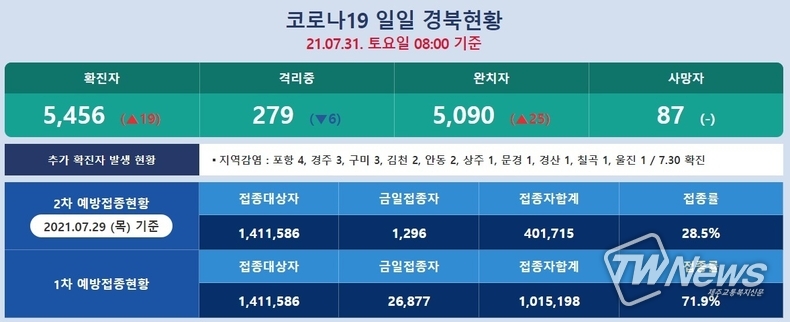 31일 경상북도에 따르면 이날 0시 기준 경산 1명, 포항 4명, 구미 3명, 경주 3명, 김천 2명, 안동 2명, 칠곡 1명, 상주 1명, 문경 1명, 울진 1명 등 19명이 코로나 확진 판정을 받았다.