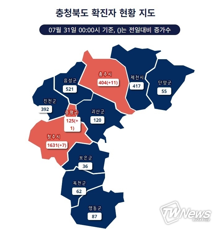 충북도에 따르면 청주 7명, 충주 11명, 증평 1명 등 19명이 코로나 확진 판정을 받았다.