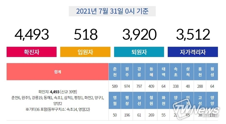 30일 기준 춘천6명, 원주5명, 강릉19명, 동해1명, 속초1명, 삼척1명, 평창1명, 화천2명, 양구1명, 양양2명 등 39명이 코로나 확진 판정을 받았다.