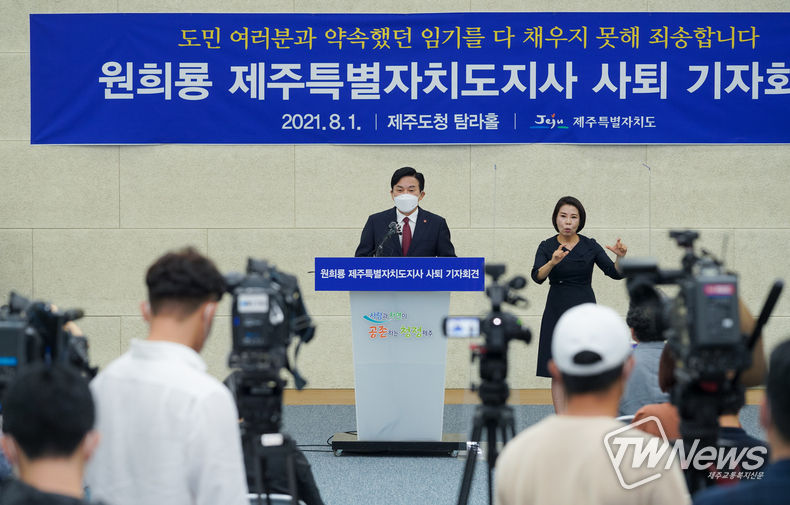 원 지사는 임기를 다하지 못하고 사임하게 되서 도민에게 사과의 뜻을 전했다.