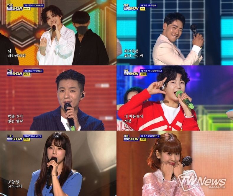 윤태화의 ‘찍고 찍고 찍고’, 홍지윤의 ‘오라’, 강혜연의 ‘척하면 척’ 등 7월 차트에서 엄선한 곡들의 하이라이트 무대가 펼쳐진다. 또한, 꾸준히 사랑 받고 있는 태권 트롯 나태주와 감성 보컬 양지은, 국방의 의무를 다하고 있는 김수찬까지 반가운 무대들이 이어진다.