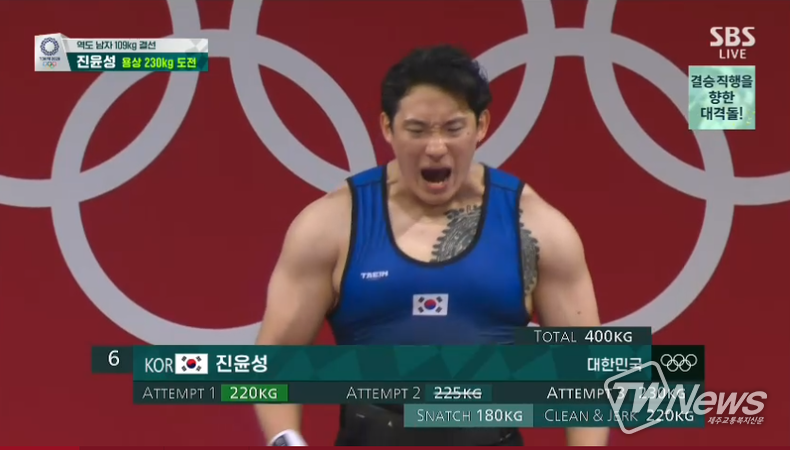 [제주교통복지신문 최효열 기자] 진윤성 선수가 역도 남자 109kg급 결선 용상 2, 3차 시도에서 실패했다.