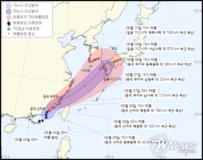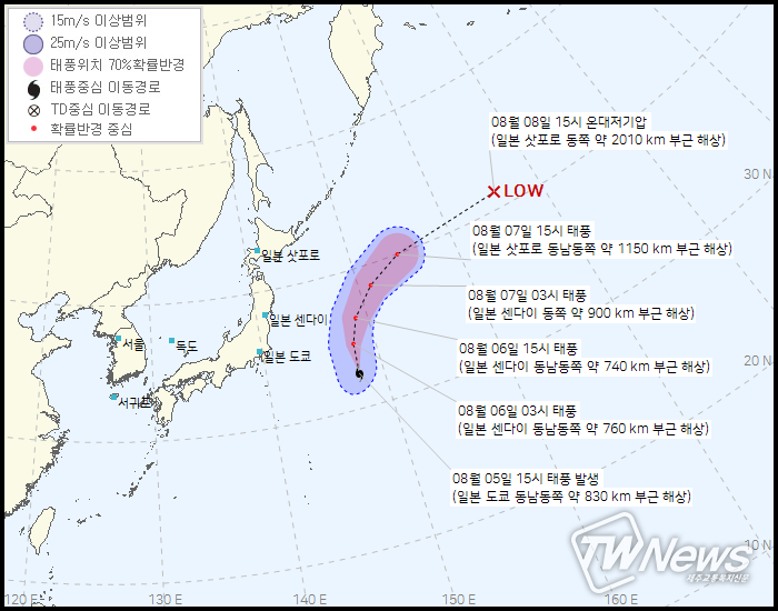 8일 15시 일본 삿포로 동쪽 약 2010km부근해상에서 온대저기압으로 약화될 예정이다.