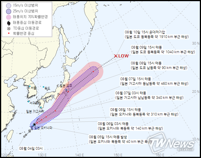 10일 15시 일본 도쿄 동북동쪽 약 1910km부근해상에서 온대저기압으로 약화될 예정이다.