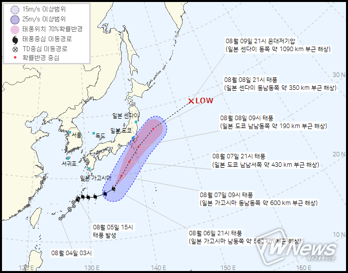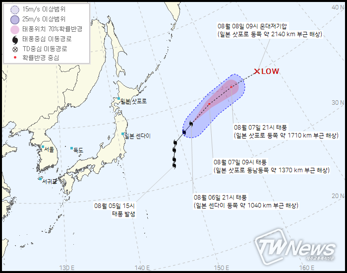 8일 09시 일본 삿포로 동쪽 약 2140km부근해상에서 온대저기압으로 약화될 예정이다.