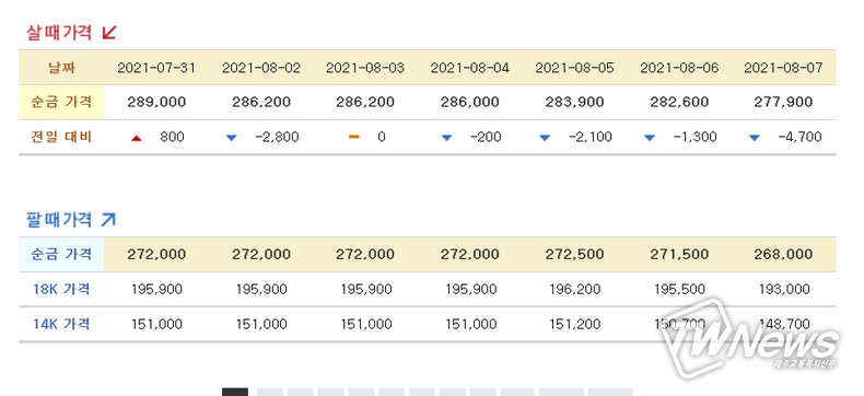 8월7일 한국표준금거래소에 따르면 순금 1돈(Gold24k-3.75)은 27만 7,900원에 구입 가능하다. 어제보다 4,700원 떨어졌다.