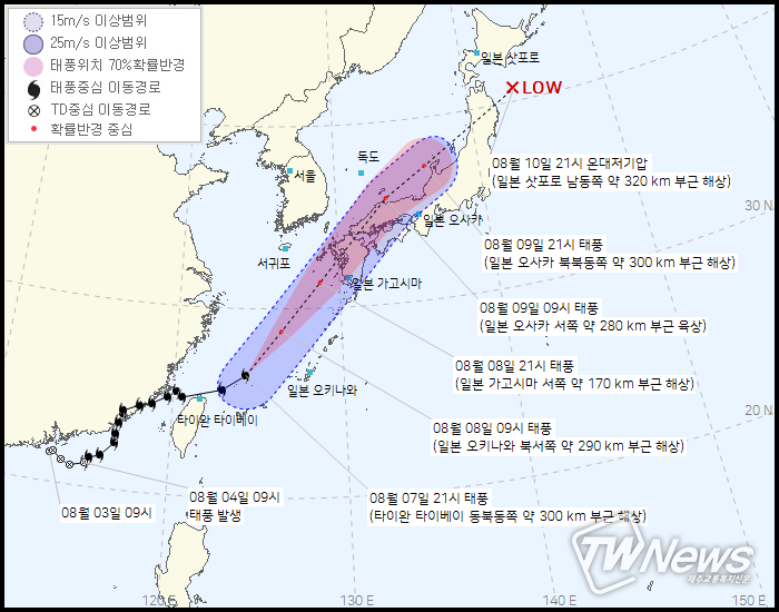 10일 21시 일본 삿포로 남동쪽 약 320km뷰근해상에서 온대저기압으로 약화될 예정이다.