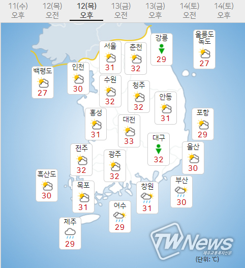 [제주교통복지신문 최효열 기자] 기상청은 목요일인 12일 낮최고기온 서울31도, 대전33도, 광주32도, 여수29도, 강릉29도, 대구32도, 부산30도, 제주도29도를 기록하겠다고 날씨예보를 전했다.