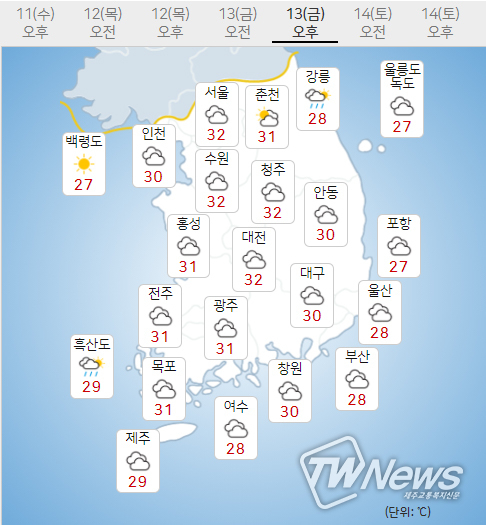(13일) 아침최저기온은 서울 24도, 인천 24도, 수원 24도 등 20~25도, 낮최고기온은 서울 32도, 인천 30도, 수원 32도 등 30~33도가 되겠다.