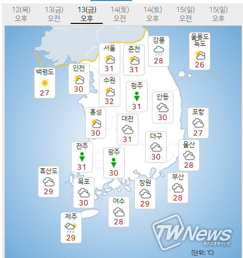 (13일) 아침최저기온은 서울 24도, 인천 25도, 수원 24도 등 20~25도, 낮최고기온은 서울 31도, 인천 30도, 수원 32도 등 30~32도가 되겠다.