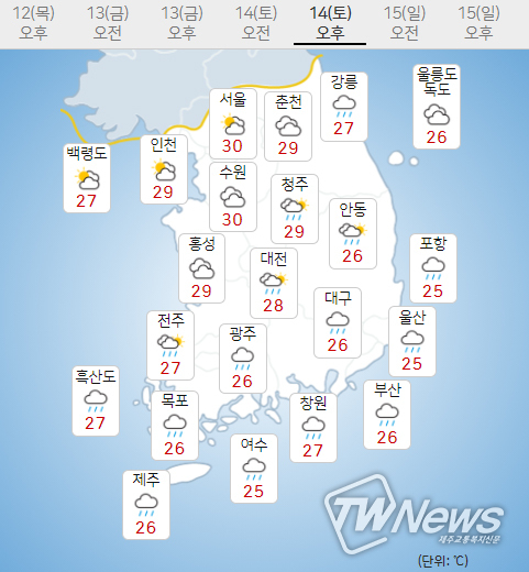 (14일) 아침최저기온은 서울 24도, 인천 24도, 수원 24도 등 20~25도, 낮최고기온은 서울 30도, 인천 29도, 수원 30도 등 28~31도가 되겠다.