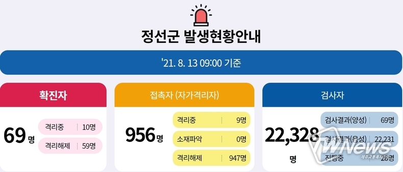 14일 정선군에 따르면 전날인 13일 관내에서 70~76번 코로나 확진자가 발생했다.