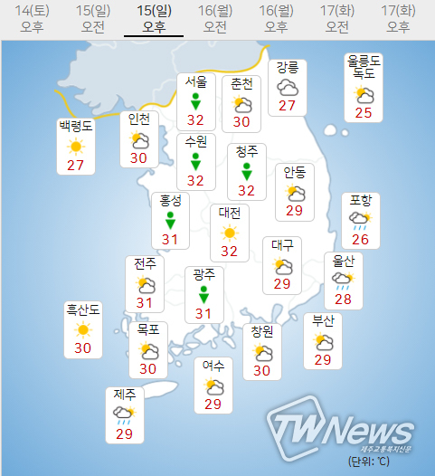(15일) 아침최저기온은 서울 22도, 인천 23도, 수원 22도 등 18~24도, 낮최고기온은 서울 32도, 인천 30도, 수원 32도 등 30~33도가 되겠다.