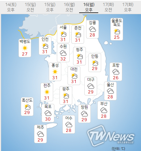 (16일) 아침최저기온은 서울 23도, 인천 23도, 수원 23도 등 18~24도, 낮최고기온은 서울 31도, 인천 31도, 수원 32도 등 30~33도가 되겠다.
